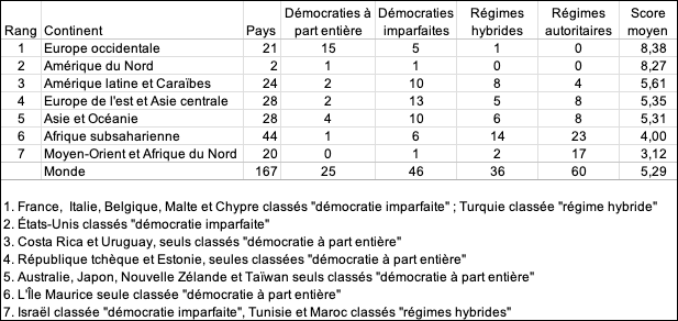 La démocratie prévaut nettement en Europe occidentale et en Amérique du Nord. Elle est dégradée en Amérique latine et Caraïbes, en Asie et Océanie, ainsi qu’en Europe orientale, du fait de la présence d’un certain nombre de régimes autoritaires. Ces derniers sont majoritaires en Afrique subsaharienne et plus encore au Moyen-Orient et en Afrique du Nord, qui arrivent en dernière position.